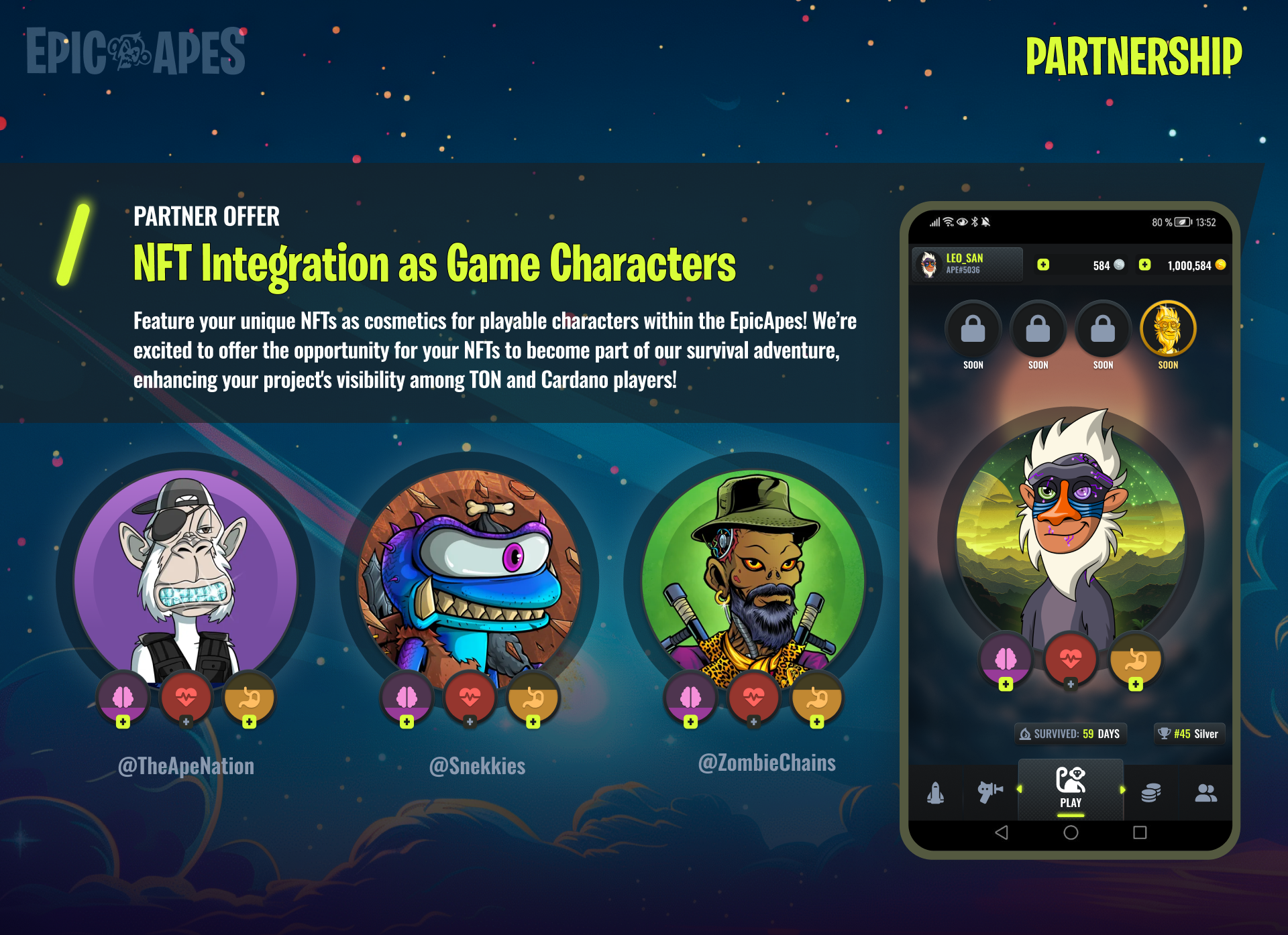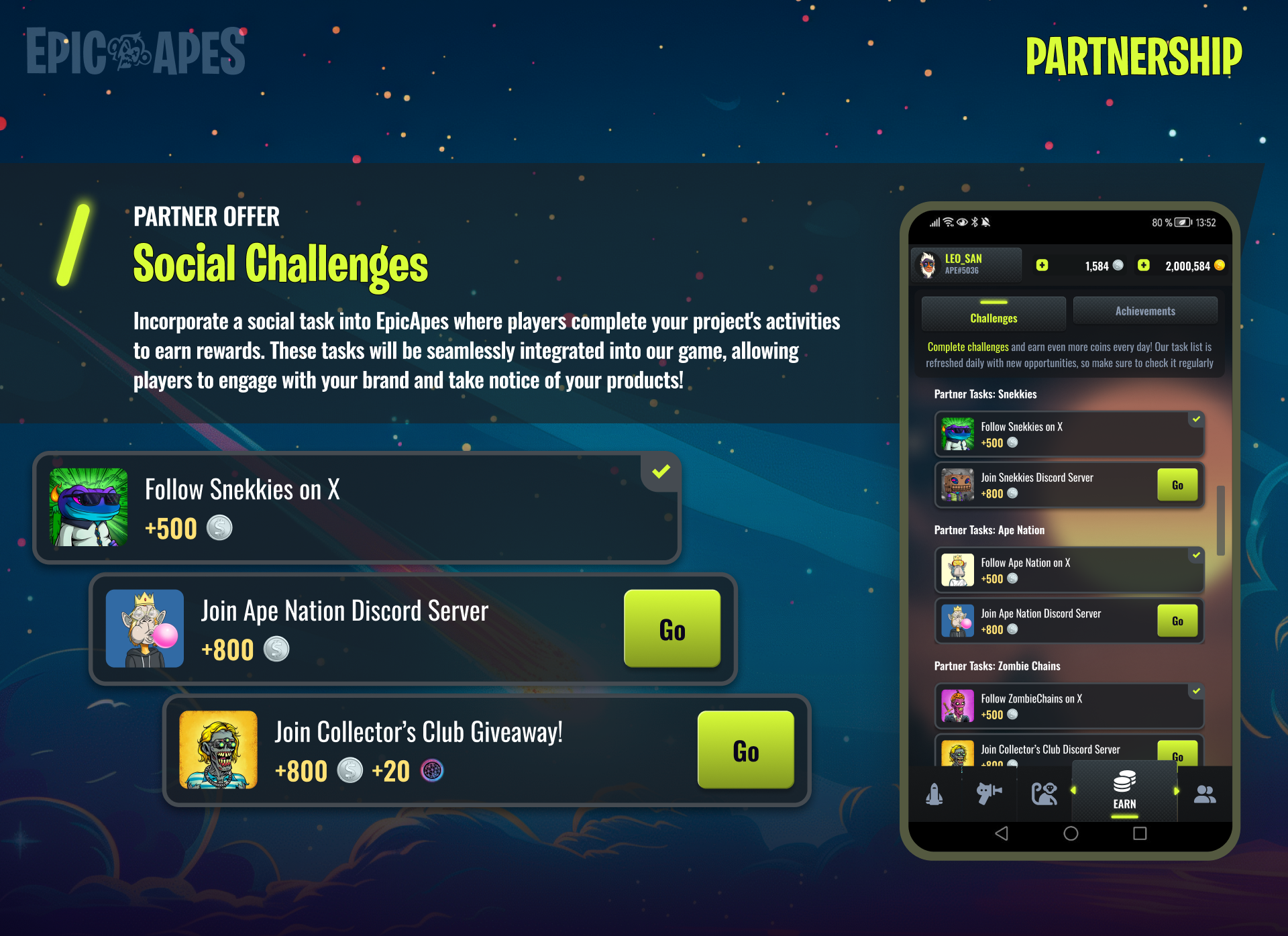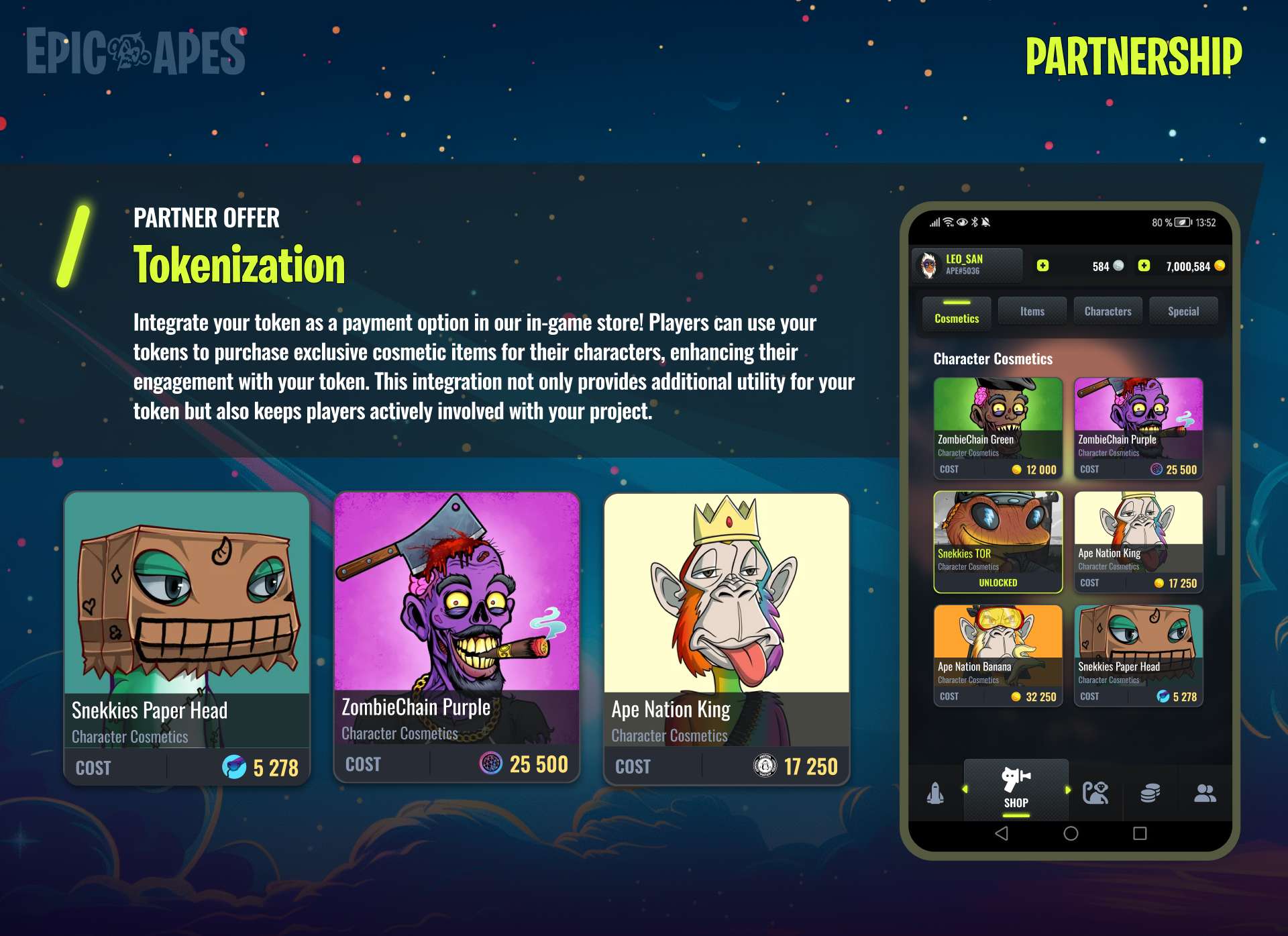 To explore collaboration opportunities, please reach out to us on Discord or Twitter. We offer numerous ways for projects to grow together, including features such as cosmetic items for game characters, tokenization to accept your token as a payment method, giveaways within our game, and a task system where players can complete social tasks for rewards and audience growth.